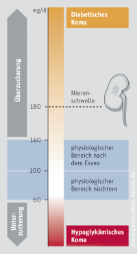 Grenzwerte des Blutzuckerspiegels (alle Angaben in mg/dl): Unterhalb eines Werts von 60 liegt eine Unterzuckerung (Hypoglykämie) vor, oberhalb von 140 spricht man von Überzuckerung (Hyperglykämie). Ab einer Blutzuckerkonzentration von 180 ist die Nierenschwelle überschritten, das heißt die Niere schafft es nicht mehr, den in den Urin abgegebenen Zucker (Glukose) aufzunehmen und ins Blut zurückzuführen. Folglich findet man Glukose im Urin (Glukosurie). Die Glukosurie wird durch einen einfachen Test mit Urin-Teststreifen nachgewiesen.