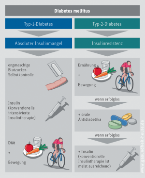 Übersicht. Ziel der Diabetesbehandlung ist eine möglichst normale Blutzuckereinstellung, um Wohlbefinden und Leistungsfähigkeit wiederherzustellen sowie Langzeitschäden vorzubeugen. Während dies beim Typ-1-Diabetes neben einer angemessenen Ernährung ein lebenslanges Spritzen von Insulin bedeutet, ist dies beim Typ-2-Diabetes nur nötig, wenn die Betazellen selbst nicht mehr ausreichend Insulin produzieren. Basis jeder Typ-2-Diabetestherapie bildet daher eine diabetesgerechte Ernährung, regelmäßige Bewegung und der Abbau von Übergewicht.