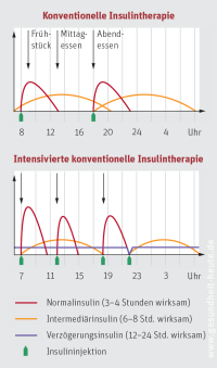 Für einen unregelmäßigen Lebensrhythmus eignet sich hingegen die intensivierte konventionelle Insulintherapie (ICT), sie setzt aber Eigenverantwortung und Schulung voraus. Vor jeder Mahlzeit muss der Blutzucker gemessen und die benötigte Insulinmenge für die jeweils aktuelle Stoffwechsellage berechnet und gespritzt werden. Zusätzlich wird der Grundbedarf mit 1(–2) täglichen Injektionen eines lang wirksamen Verzögerungsinsulins gedeckt. So kann viel oder wenig gegessen, eine Zwischenmahlzeit eingeschoben oder eine Mahlzeit ausgelassen werden – ganz so, wie es der Tagesablauf erfordert. Bei richtiger Durchführung ist auch die Blutzuckerführung besser als bei der konventionellen Insulintherapie, der Blutzucker schwankt also weniger.