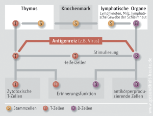 Organe, Zellen und Funktionsweise des spezifischen Immunsystems in der (vereinfachten) Schemazeichnung. Eine Schlüsselposition nimmt bis zur Pubertät der Thymus (Thymusdrüse) ein. Er liegt hinter dem oberen Teil des Brustbeins im Brustkorb, in ihm reifen die T-Lymphozyten zu funktionsfähigen Abwehrzellen. Mit Beginn des Erwachsenenalters bildet sich der Thymus zurück, und Knochenmark und Lymphknoten übernehmen seine Funktion.