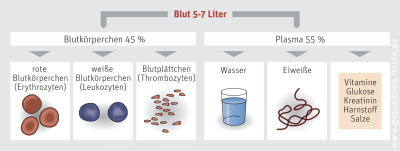 Die normale Blutmenge beträgt beim Erwachsenen knapp 1/13 des Körpergewichts, also 5–7 Liter. Davon sind etwa 55 % flüssiges Blutplasma und 45 % feste Blutkörperchen.