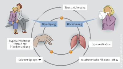 In den meisten Fällen liegen der Hyperventilation psychische Ursachen zugrunde. Sie kommt besonders bei Jugendlichen und jungen Erwachsenen vor. Starke Emotionen, Stress, Schlafmangel und Angstzustände (Prüfungen, Auftritte) führen bei den Betroffenen zur massiven Atemtätigkeit. Die Lunge atmet zu viel Kohlendioxid ab und erhöht so den pH-Wert des Bluts. Dadurch binden Eiweiße im Blutplasma verstärkt freies Kalzium. Die Konzentration an freiem Kalzium im Blut sinkt und es kommt zu schmerzhaften, heftigen Muskelkrämpfen, eventuell mit Kribbelgefühl an den Füßen und Händen und um den Mund herum sowie zur Pfötchenstellung der Hände. Auch Schwindel, Konzentrationsstörungen und leichte Bewusstseinstrübungen können auftreten. Das verstärkt wiederum die Angst. Ein Teufelskreis entsteht, aus dem die Betroffenen von selbst nicht wieder herauskommen.