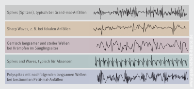 Unabdingbare technische Untersuchung ist das EEG, mit dem epilepsietypische Veränderungen wie etwa Spike-wave-Komplexe (siehe Abbildung) aufgezeichnet werden können. Allerdings zeigt sich mitunter auch bei Gesunden eine Auffälligkeit oder umgekehrt trotz Epilepsie ein Normalbefund, sodass die Diagnose oft mehrere aufeinanderfolgende bzw. wiederholte EEG-Untersuchungen in verschiedenen Situationen erfordert: