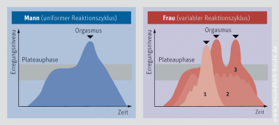 Männer brauchen normalerweise eine längere Erholungspause (Refraktärzeit), um erneut sexuelle Spannung aufbauen zu können, während viele Frauen zu multiplen Orgasmen, d. h. mehreren Orgasmen kurz hintereinander, fähig sind. Trotzdem benötigen Frauen meist eine längere Stimulation als ihr Partner, um zum Orgasmus zu gelangen. Sie verfügen allerdings über eine größere Variationsbreite sexueller Stimulationsmechanismen. Viele Frauen, bei denen beim vaginalen Geschlechtsverkehr der Orgasmus ausbleibt, erleben ihn durch manuelle oder orale Stimulation der Klitoris. Der fehlende Orgasmus durch vaginale Stimulation stellt übrigens eine normale Variation der weiblichen Sexualreaktion dar und zählt nicht zu den Orgasmusstörungen. Für die Fortpflanzungsfähigkeit spielt der Orgasmus der Frau keine Rolle, während beim Mann der Samenerguss meistens an den Orgasmus gekoppelt ist.
