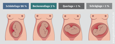 Steißlage (Beckenendlage, BEL): Während der Schwangerschaft liegt das Kind normalerweise mit dem Kopf nach oben in der Gebärmutter. Bis zur 32. Schwangerschaftswoche haben sich schon 80 % der Kinder mit dem Kopf nach unten „eingestellt“, wie die Geburtshelfer sagen, und bis zum Geburtstermin weitere 15 % – aber eben nicht alle: Etwa 4 % der Geburten erfolgen in Steißlage, d. h. das Kind kommt mit dem Kopf nach oben und dem Steiß nach unten zur Welt (Steißgeburt). Bei Frühgeburten kommt diese Lage mit 10–15 % entsprechend häufiger vor.